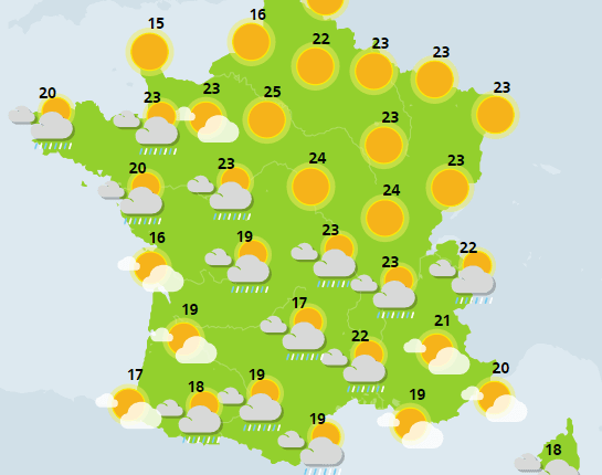 Pour les températures, les minimales iront de 6 à 13 degrés, jusqu’à 14 à 15 degrés près de la Méditerranée. L’après-midi, il fera 15 à 21 degrés dans le sud et près de la Manche, 21 à 25 degrés ailleurs, et jusqu’à 26 degrés en Alsace.