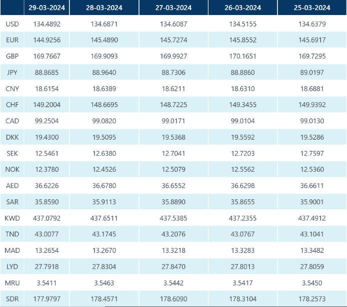 Dans la tableau ci-dessous, vous trouvez le taux change officiel du Dinar algérien face au Dollar américain, à l’Euro et à d’autres monnaies. Ce taux de change est fixé par la Banque d’Algérie et appliqué par les Banques activant en Algérie.