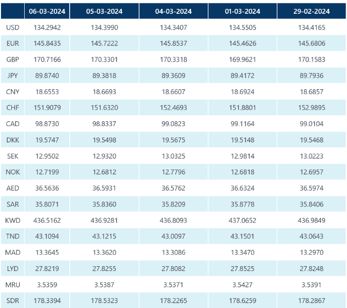 Taux de change officiel du dinar face aux monnaies étrangères ce 6 mars